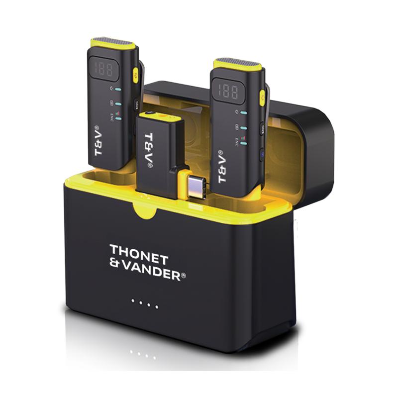 Micrófono Lavalier ideal para entrevistas, streaming, contenido, conferencias. Con receptor inalámbrico USB-C y cuna de carga.